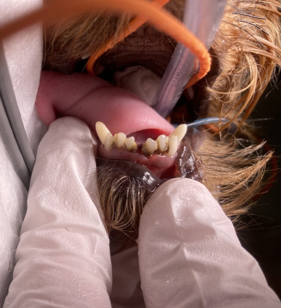 まず、超音波スケーラーを使って慎重に歯石を除去した後、どうしても抜かなければいけない歯を2本抜歯しました。