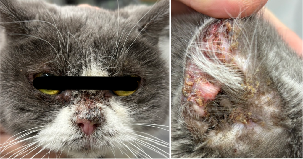 こちらは8歳の去勢オス猫の症例です。顔に重度の皮膚炎が見られ、特に鼻梁と目の周り、耳介に顕著です。皮膚は赤く、かさぶた状の病変も見られます。既往歴としては健康で、特に慢性疾患はありませんでした。