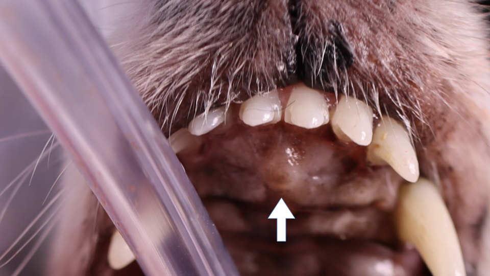 これは切歯乳頭と言って、正常犬で見られる構造です。