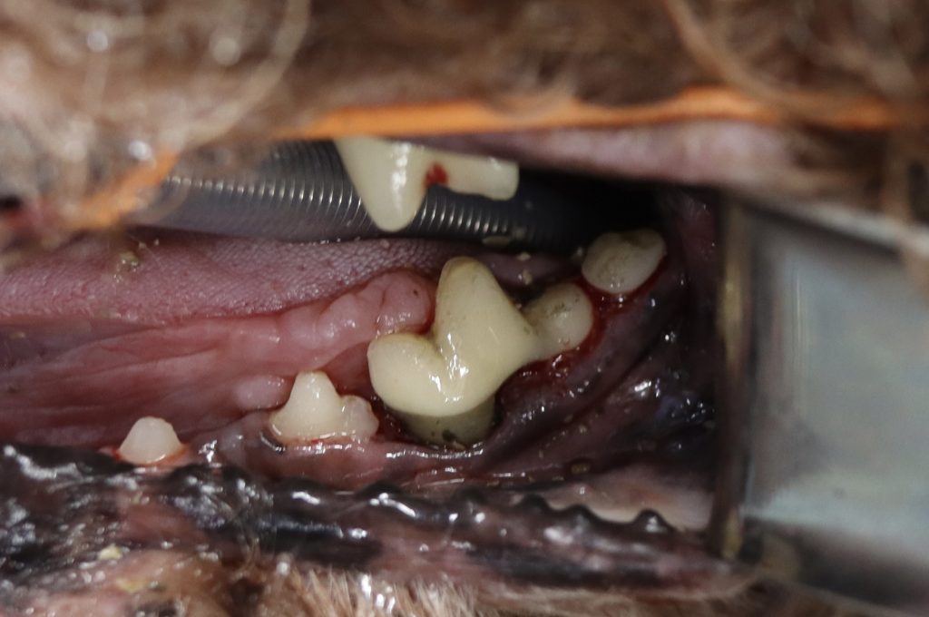 下顎の第一後臼歯に歯石が沈着し、歯肉が後退しているのが分かります。