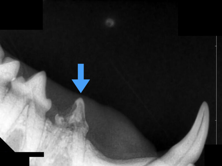 下顎の第一後臼歯に歯石が沈着し、歯肉が後退しているのが分かります。