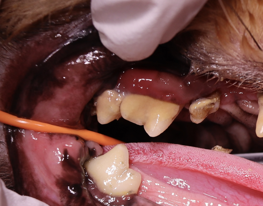 上顎の第四前臼歯と第一後臼歯に歯石が沈着し、歯肉が赤くなっています。