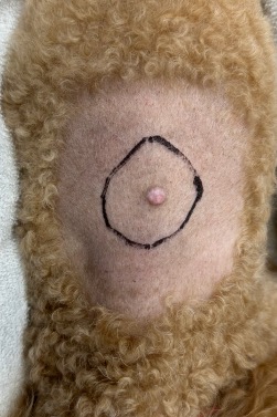 皮膚肥満細胞腫の症状は多様で、腫瘤(しこり)が見られる場合もあれば、発赤やかゆみ、時には潰瘍化していることもあります。また、肥満細胞が放出するヒスタミンの影響で、皮膚が炎症を起こしやすくなります。このため、虫刺されやアレルギー反応と間違えられることも少なくありません。