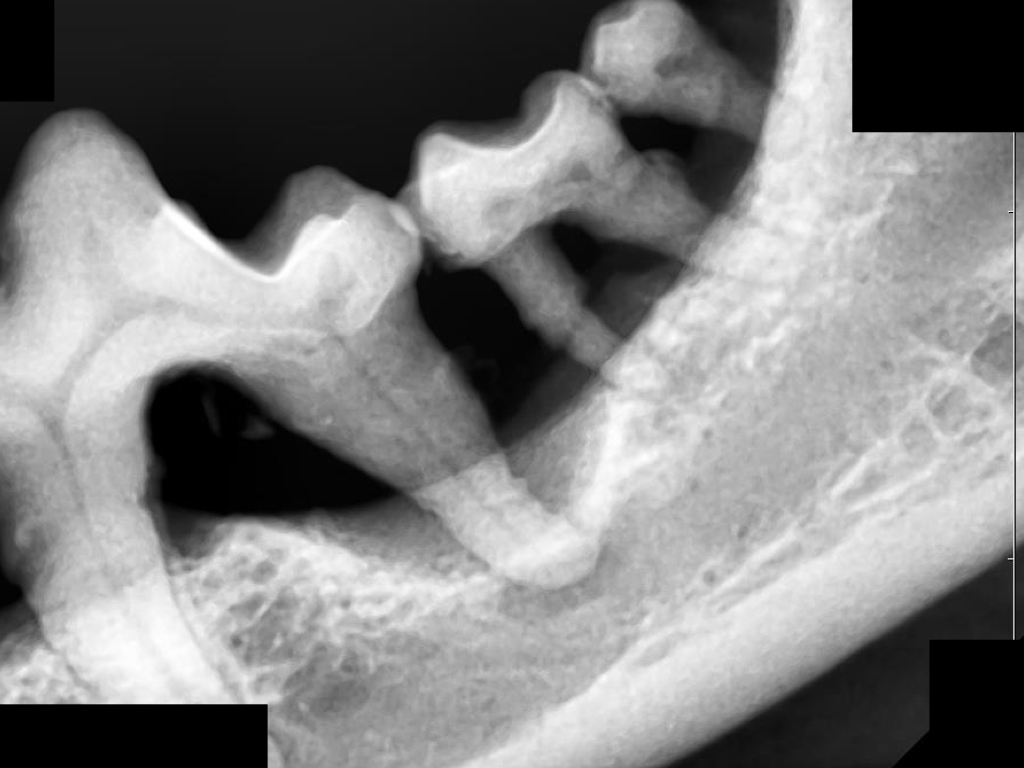 左下顎の第四前臼歯から第三後臼歯にかけて、歯根や歯根の分岐部が見えています。