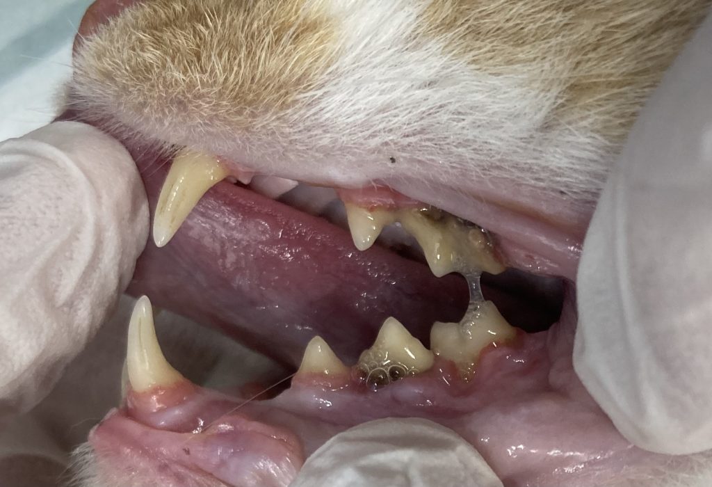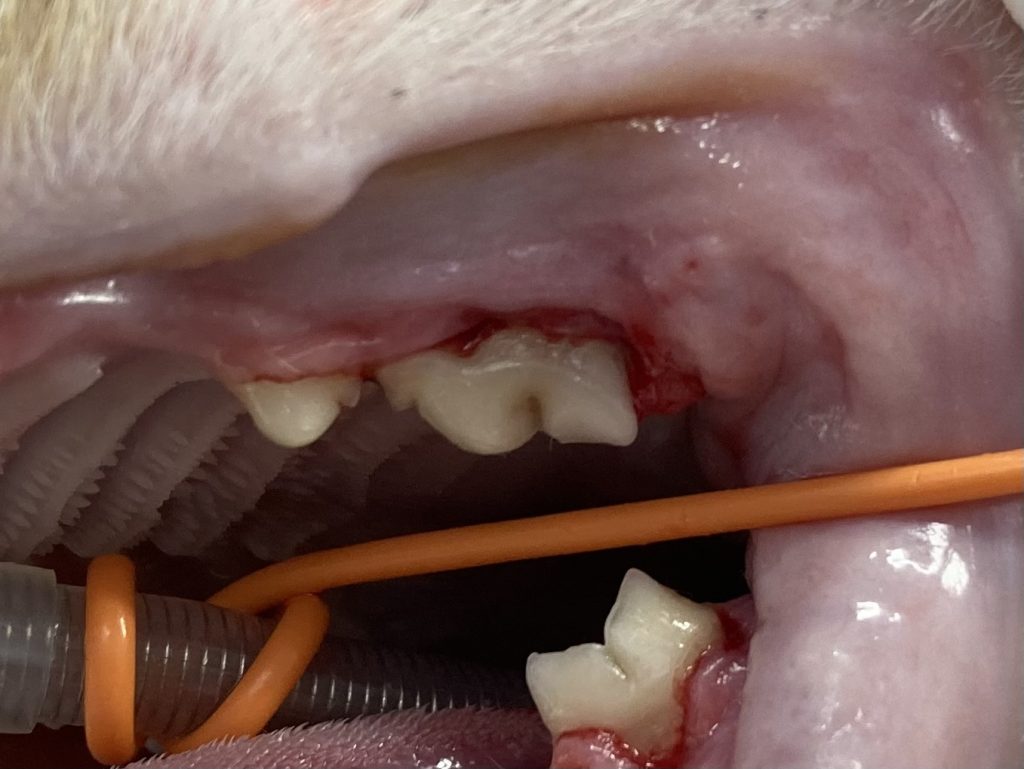 この子は年齢が若く、不妊手術で麻酔をかけるにあたって上顎臼歯の歯冠切除を行いました。