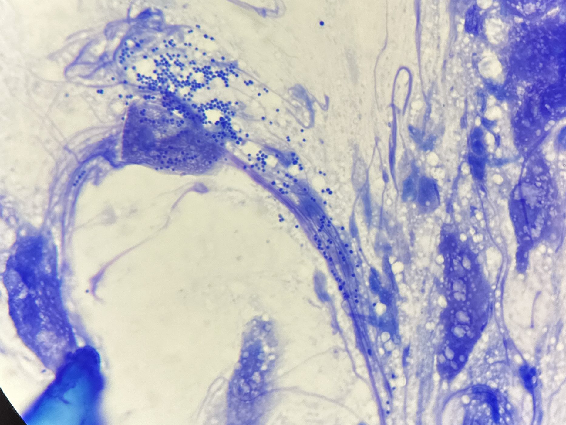 - 1000倍の顕微鏡観察により、膿皮症の典型的な細胞像(好中球やマクロファージ内の球菌)を確認。