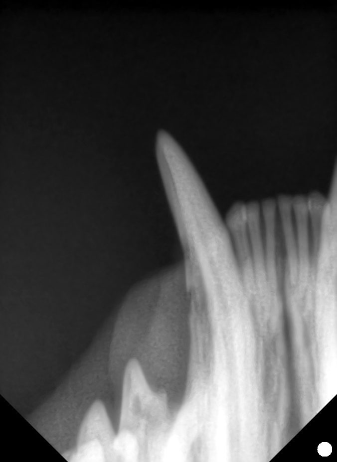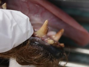 左下顎の犬歯に特徴的な赤桃色の肉芽組織が被さっています。