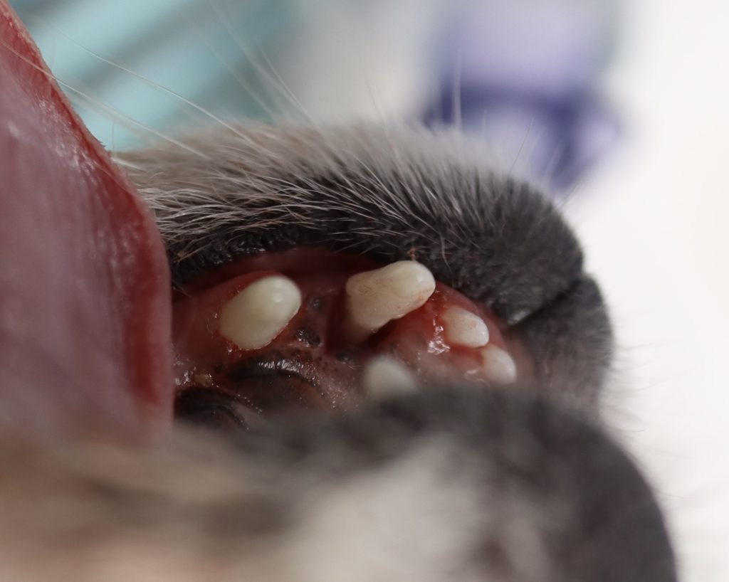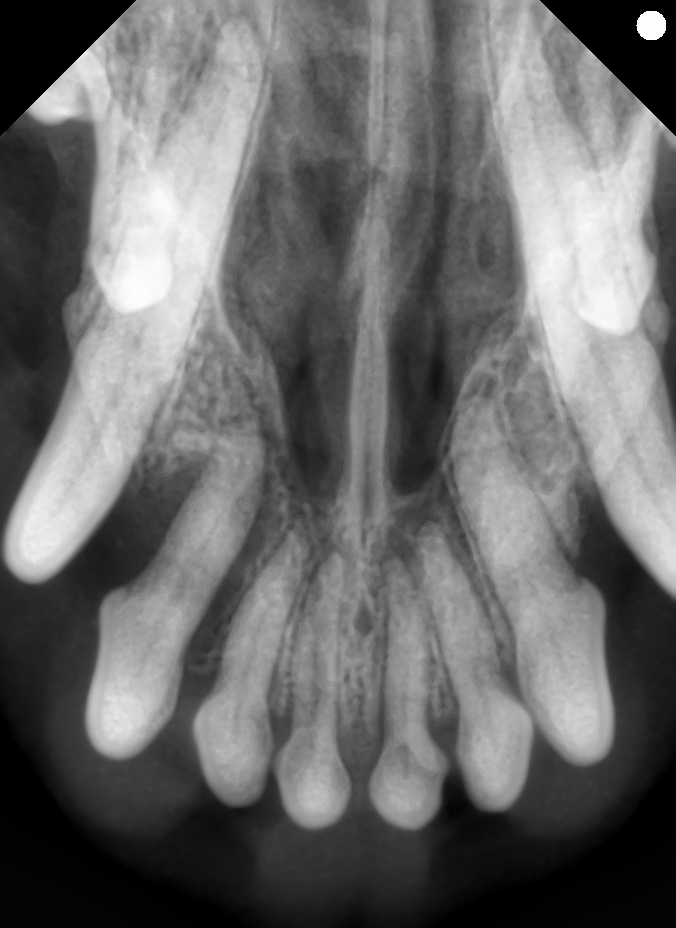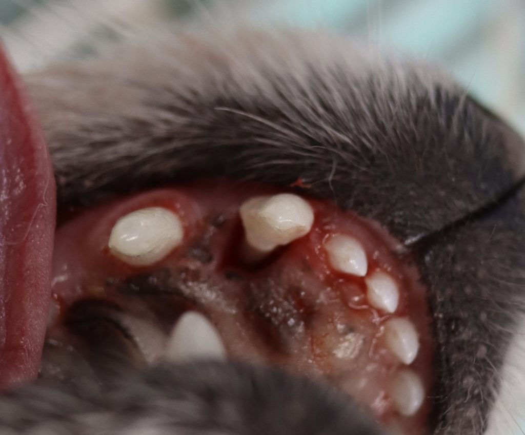 上顎切歯の吻側の歯槽骨が再生している所見が認められます。また、尾側の骨欠損部位も骨増生が認められ、