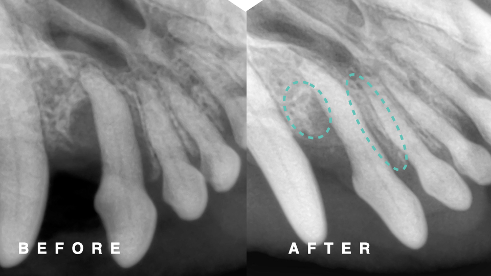 下の写真は処置時の歯槽骨と術後1.5ヶ月の歯科レントゲン写真です。